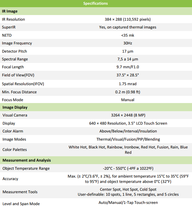 The thermal camera TherCam384PLUS is designed for temperature measurement to find invisible faults. A highly sensitive VOx detector (NETD < 35 mK), IR resolution up to 384 x 288 (110,592 pixels) provides a distinct thermal vision of the target.. The thermography ranges from ‐20°C to 550°C (‐4°F to 1022°F) which meets most situations. It allows Text or audio annotations within the images instead of taking notes by hand, helping to improve inspection efficiency and productivity. The device is mainly applied to various industries, such as Building, HVAC, and auto, industry, etc.